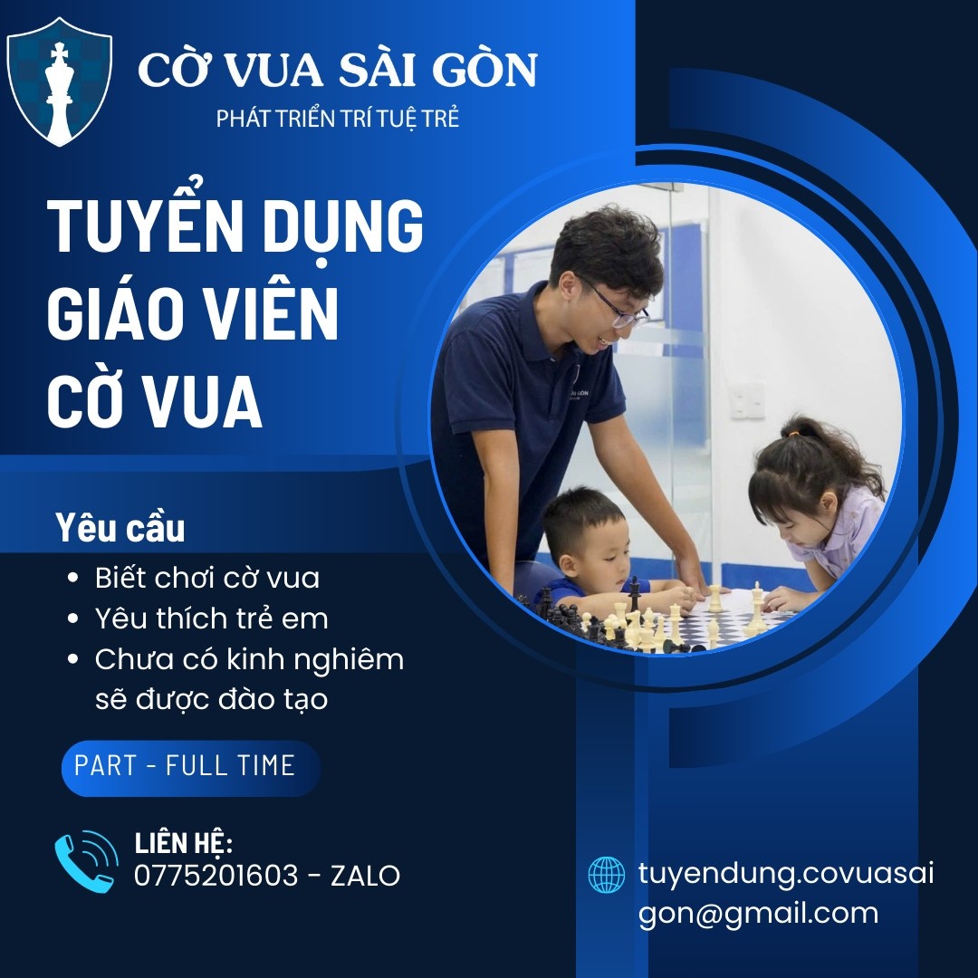 Bạn đang tìm kiếm và muốn ứng tuyển vào vị trí giáo viên dạy cờ vua đầy nhiệt huyết và tâm huyết? Hãy gia nhập đội ngũ giáo dục tại CỜ VUA SÀI GÒN! Chúng tôi đang tuyển dụng vị trí giáo viên cờ vua, nơi bạn có thể chia sẻ sự đam mê của mình với học viên và giúp họ trở thành những kỳ thủ tài năng.