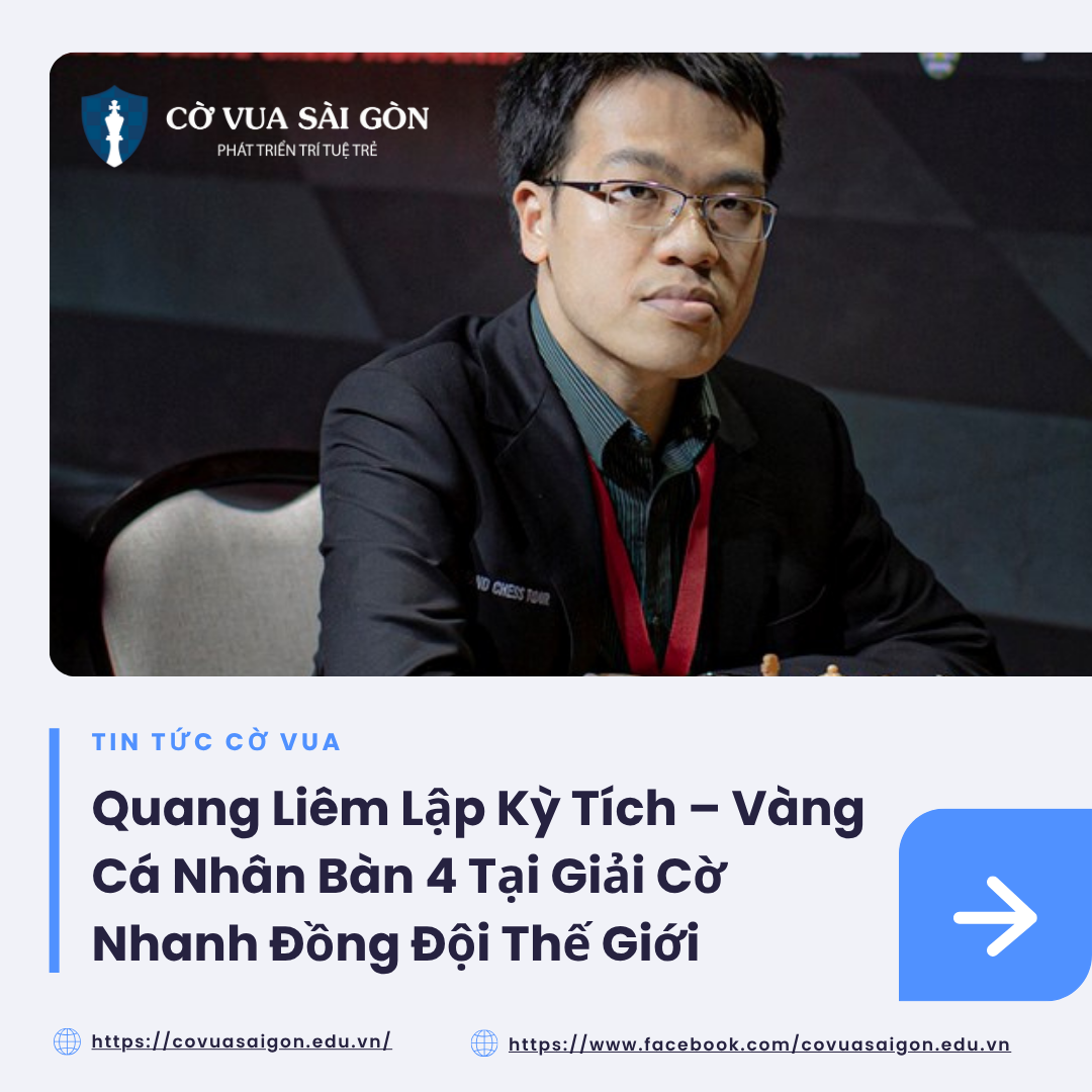 - Lê Quang Liêm tiếp tục khẳng định vị thế chủ lực của mình trong làng cờ nhanh thế giới. Chức vô địch cá nhân tại bàn 4 là phần thưởng xứng đáng cho nỗ lực và tài năng của anh. Hãy cùng chờ đợi các màn hóa thân xuất sắc tiếp theo của “ông vua cờ blitz” tại các giải trong tương lai!