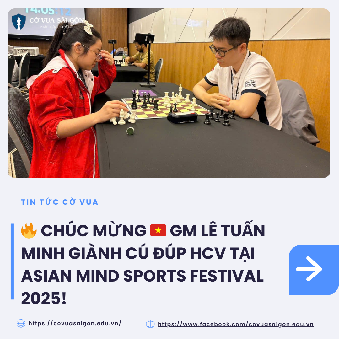 TUẤN MINH GIÀNH CÚ ĐÚP HCV TẠI ASIAN MIND SPORTS FESTIVAL 2025! Một ngày thi đấu không thể hoàn hảo hơn dành cho kỳ thủ số 1 Việt Nam ở nội dung tốc độ: — Buổi sáng: Vô địch cờ …