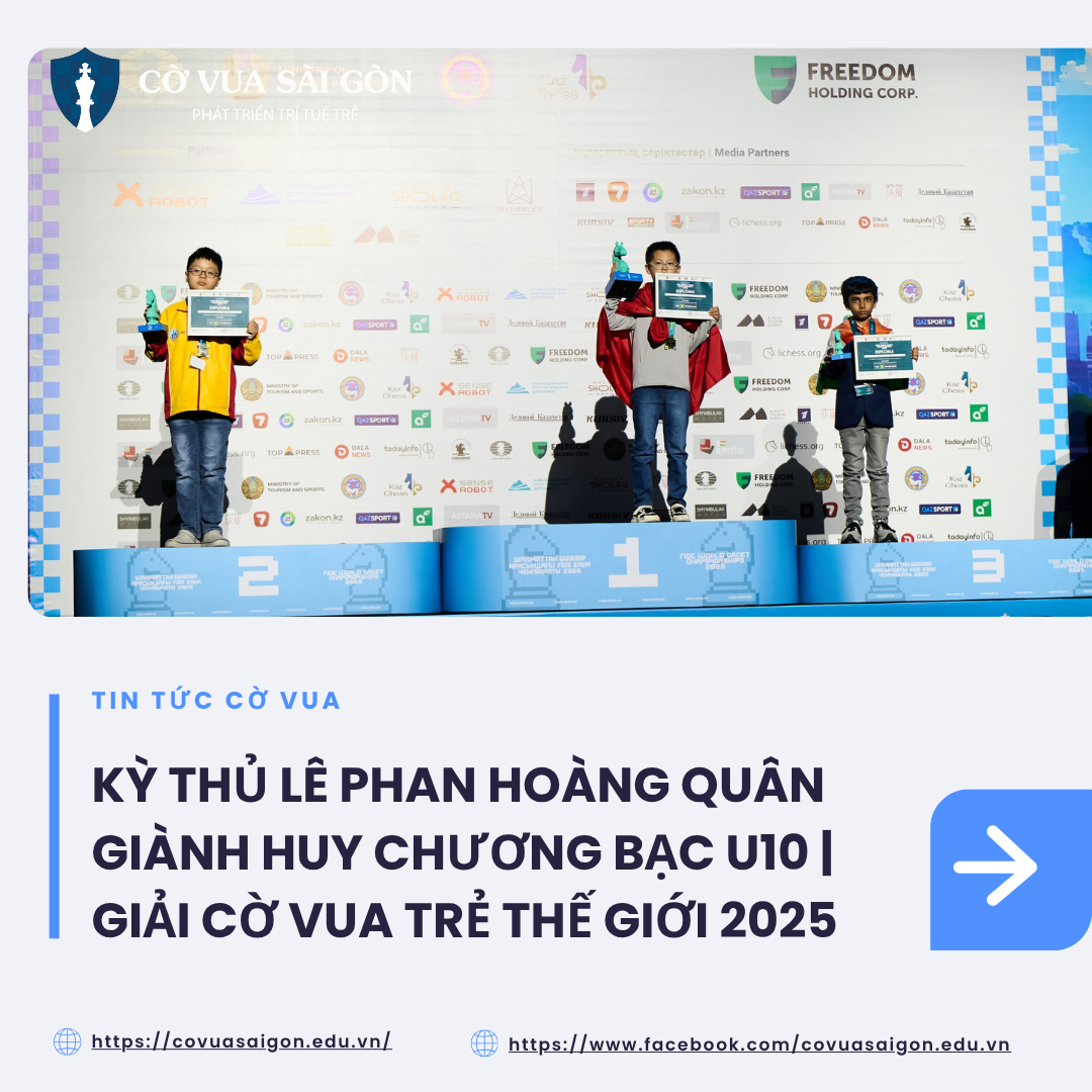 Tin vui từ Kazakhstan: Kỳ thủ trẻ của TP.HCM và đội tuyển cờ vua Việt Nam – Lê Phan Hoàng Quân – vừa xuất sắc giành Huy chương Bạc bảng U10 nam tại Giải vô địch cờ vua trẻ thế giới 2025.