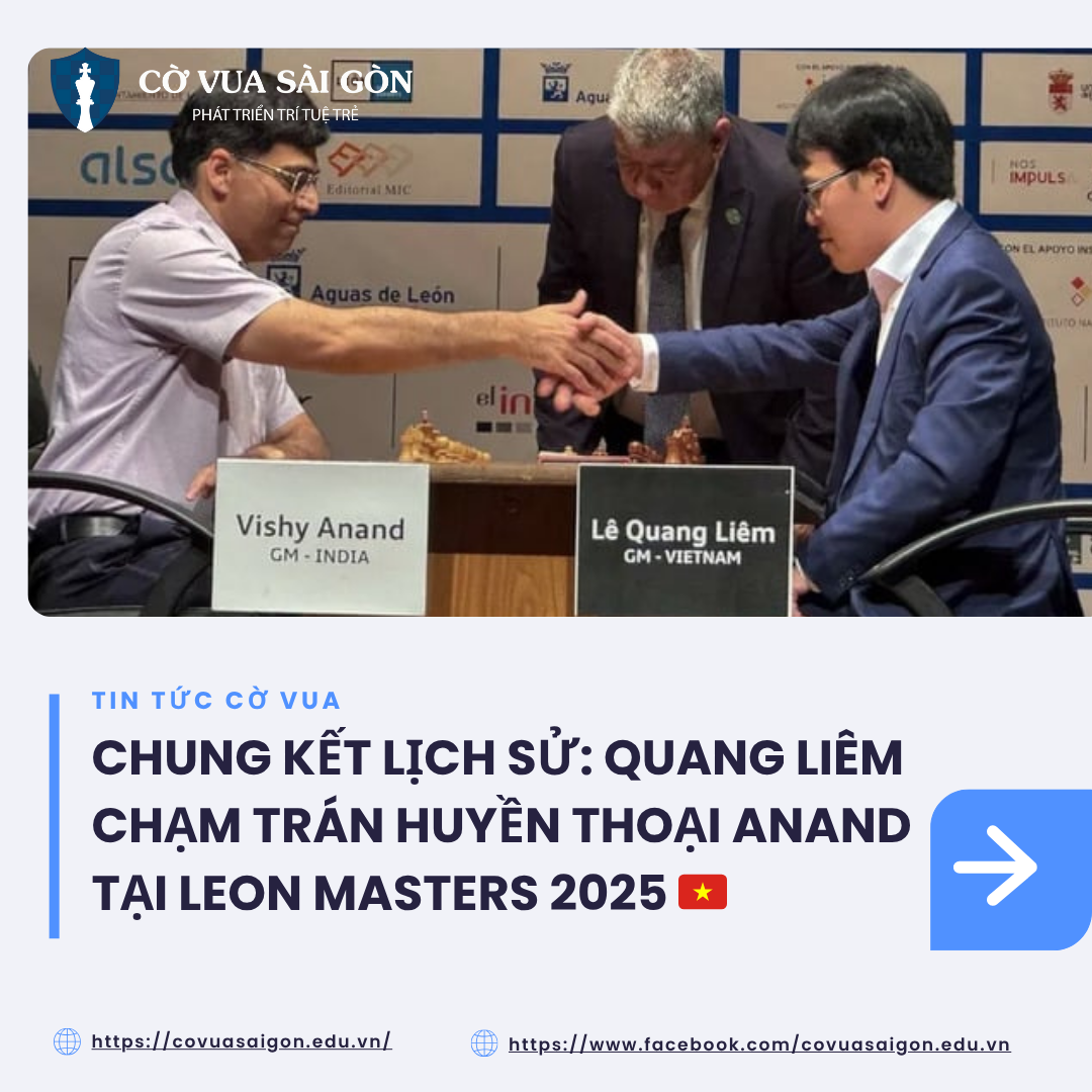 📅 Trận chung kết diễn ra lúc 21h30 ngày 6/7 (giờ Hà Nội) – một màn đọ trí được mong chờ giữa hai thế hệ kỳ thủ: Quang Liêm – đại diện cho sức trẻ châu Á và Anand – huyền thoại sống, cựu Vua cờ Thế giới (2007–2013).