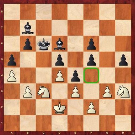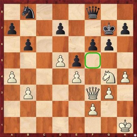 Trắng hy sinh quân Tốt để tạo ra ô mạnh f5: 1.h5 gxh5. Trắng di chuyển Mg4 đến ô mạnh vừa tạo ra bằng các nước Me3 – Mf5.